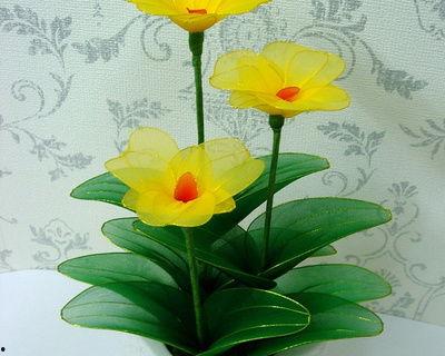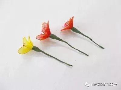 7. 制作花茎:将一根细铁丝弯曲成花茎的形状,然后用胶水将花朵固定在花茎上。