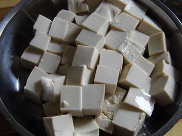 1. 将凝固好的豆腐取出,切成小块。